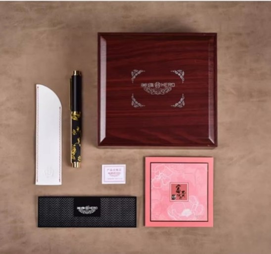 英雄·1949纪念版钢笔(左一、左三),使用独特的制笔技艺,将精心设计的梅花图案压印在笔尖上,呈现独特的质感。